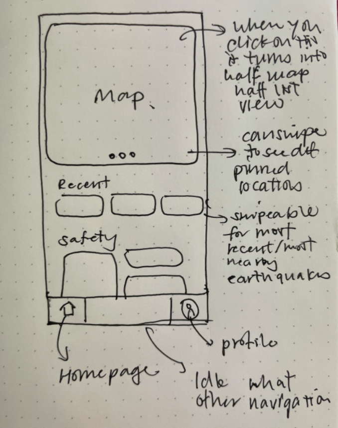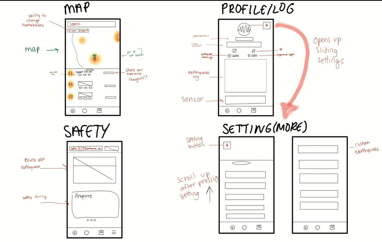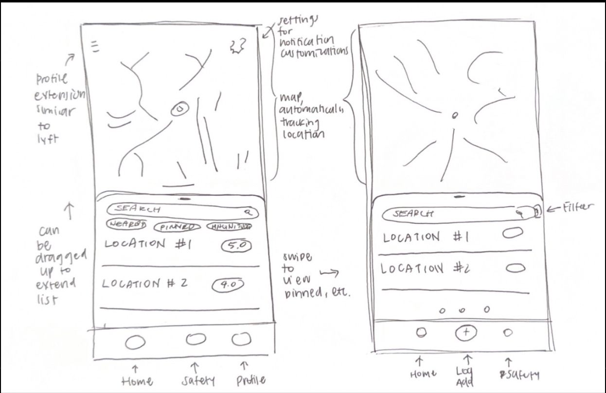 Using research insights, we created lo-fi sketches exploring ways to make a beautiful and powerful app and surface key features like alerts, and earthquake information.